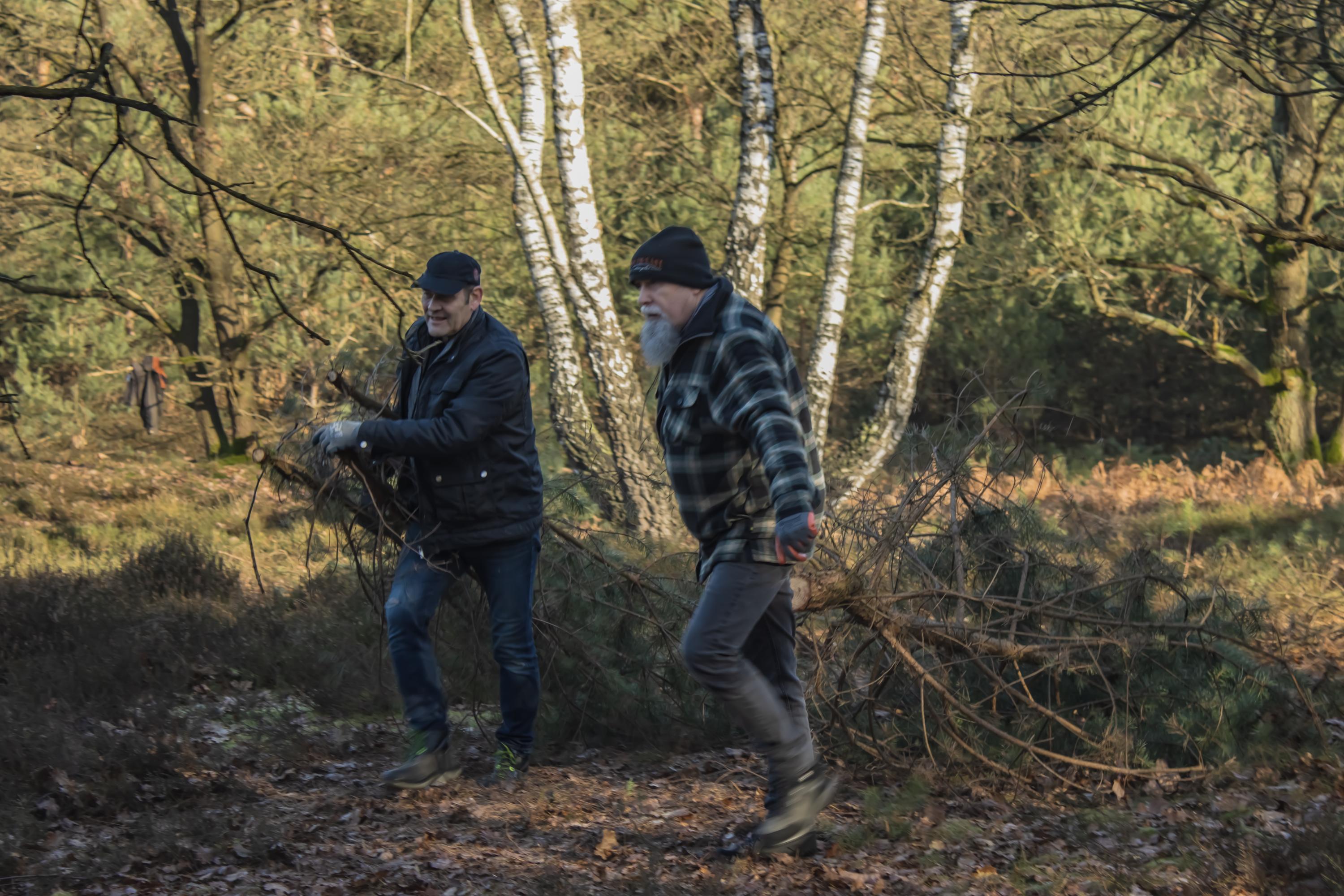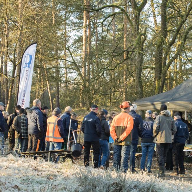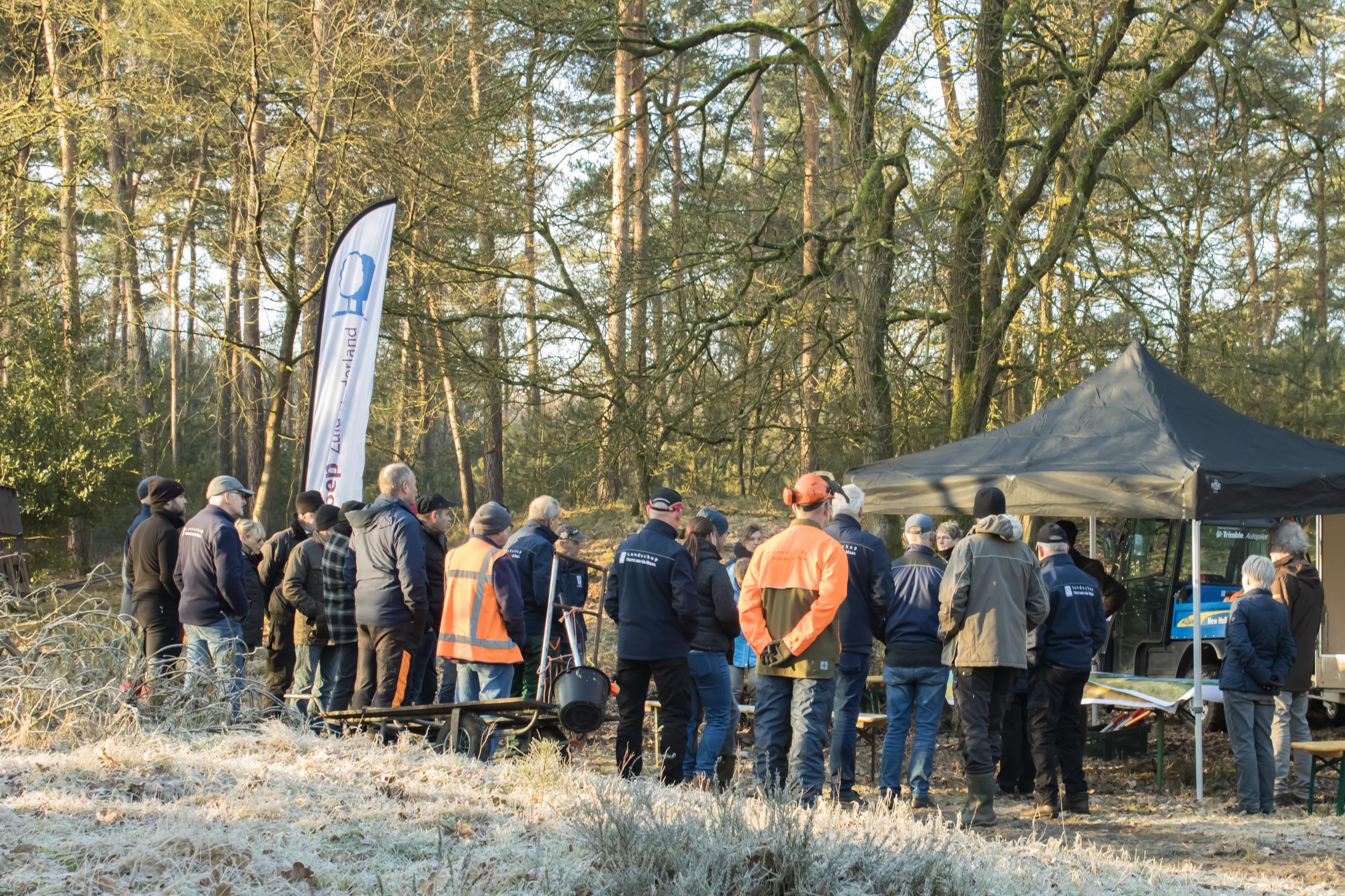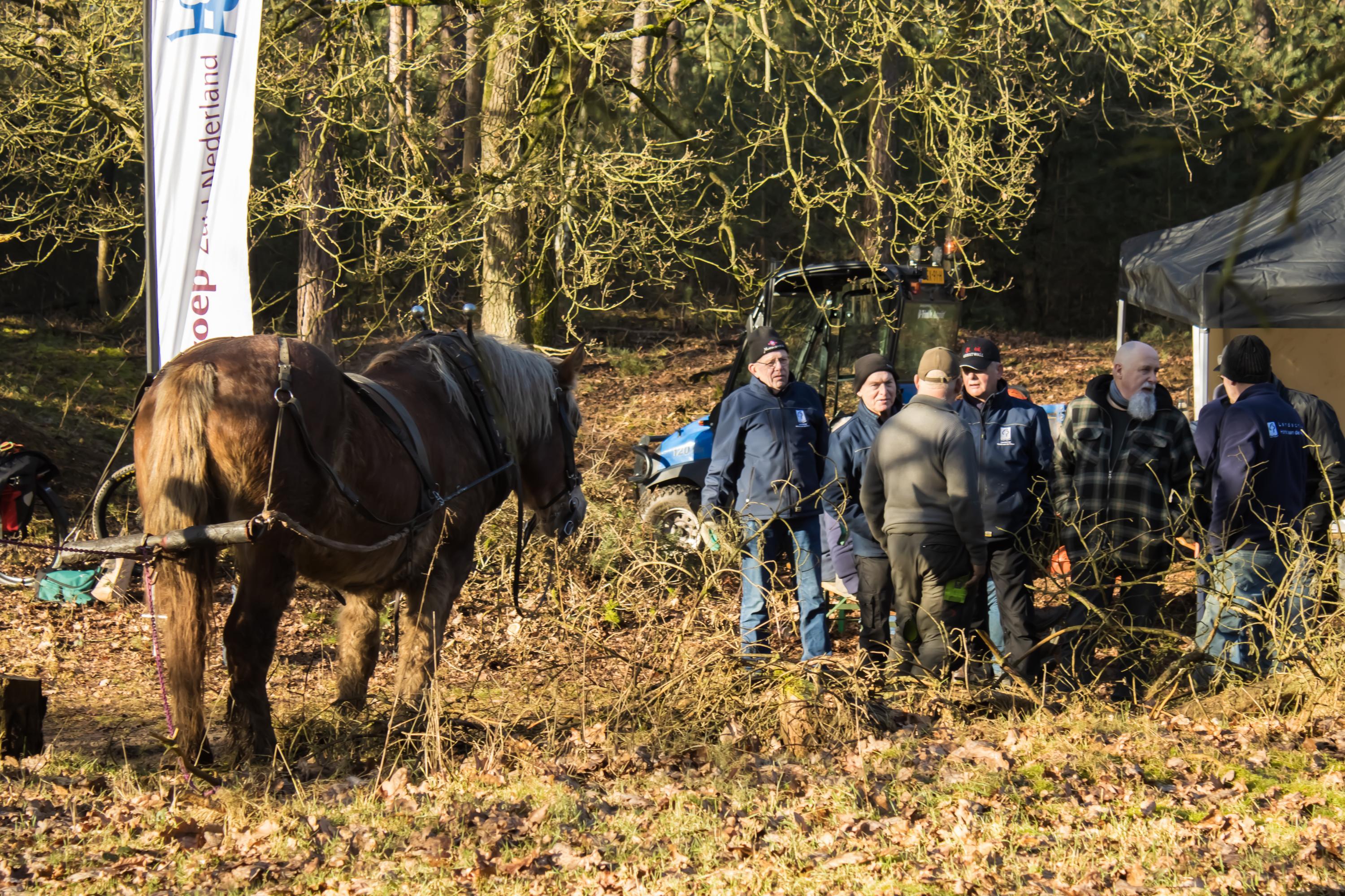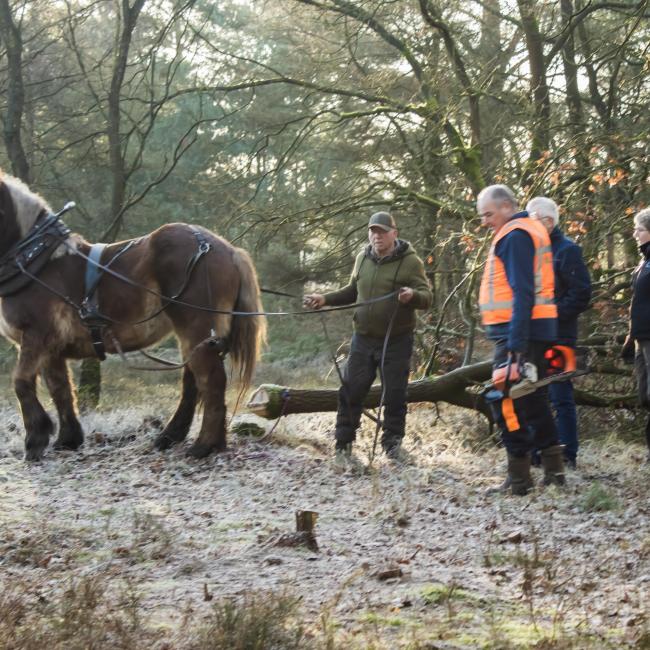 Het was een fantastische werkdag op de Swolgenderheide. Onder de eerste zonnestralen eerst uitleg over de bijzondere kenmerken van het boom-heidegebied en de uit te voeren werkzaamheden. Daarna met zijn allen aan de slag, knippen, zagen en met handkracht de dennen uit het kwetsbare gebied slepen. Voor de zwaardere bomen was er gelukkig de hulp van het trekpaard. Na afloop nog ff napraten en aan de vlaai met de blik al weer op de volgende natuurwerkdag.