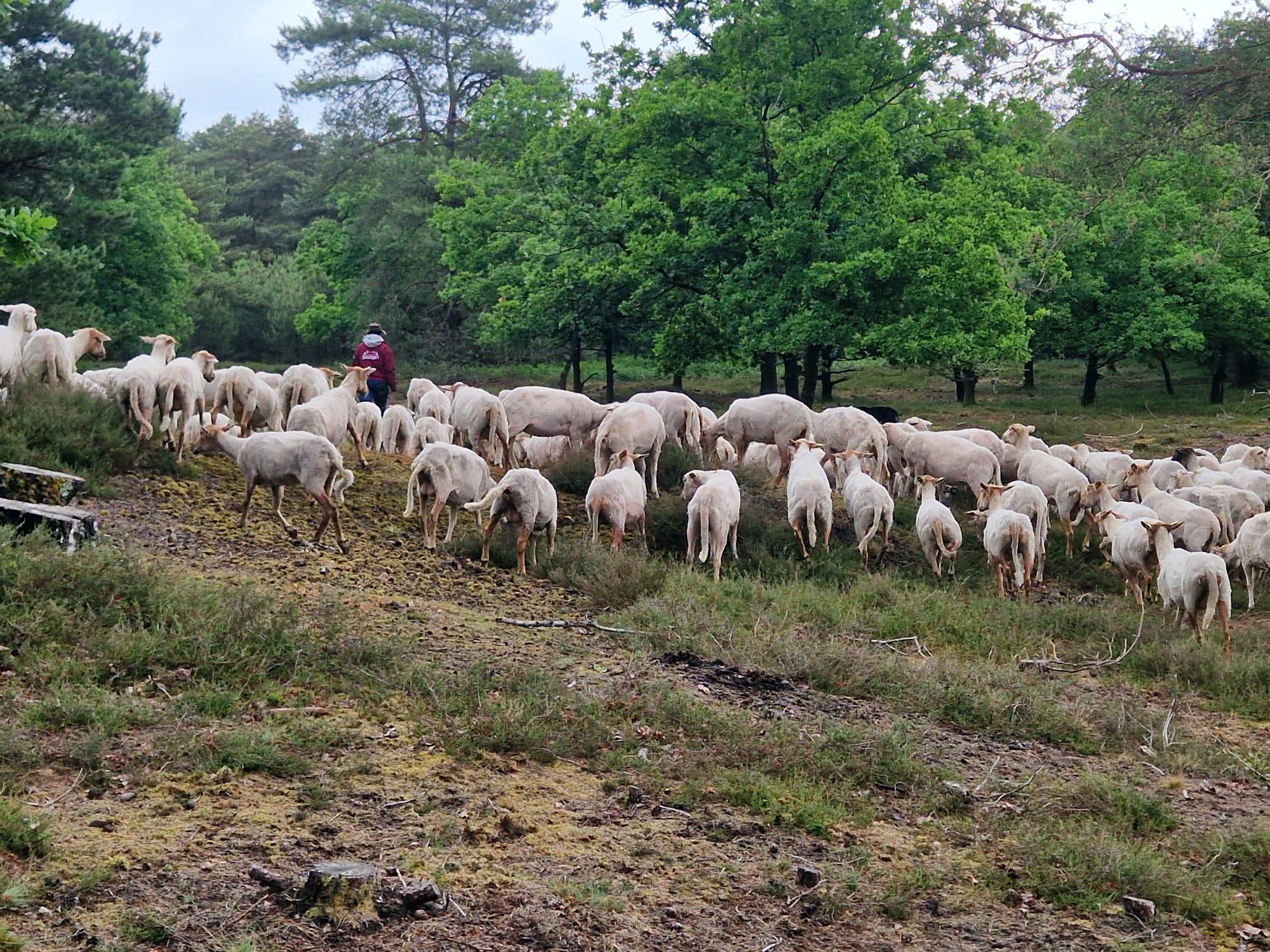 In de laatste week van mei kon je een bijzondere bezoeker tegen komen op de Swolgenderheide; herder Tineke Camps met haar 180 Kempische heideschapen en haar Border Collie Mac.