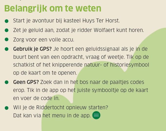 Let op: de Riddertocht  werkt alleen wanneer je start bij Ridder Wolfaert met GPS  aan. Wil je zonder GPS: toets dan de startcode in die je vindt op de bank bij Ridder Wolfaert.